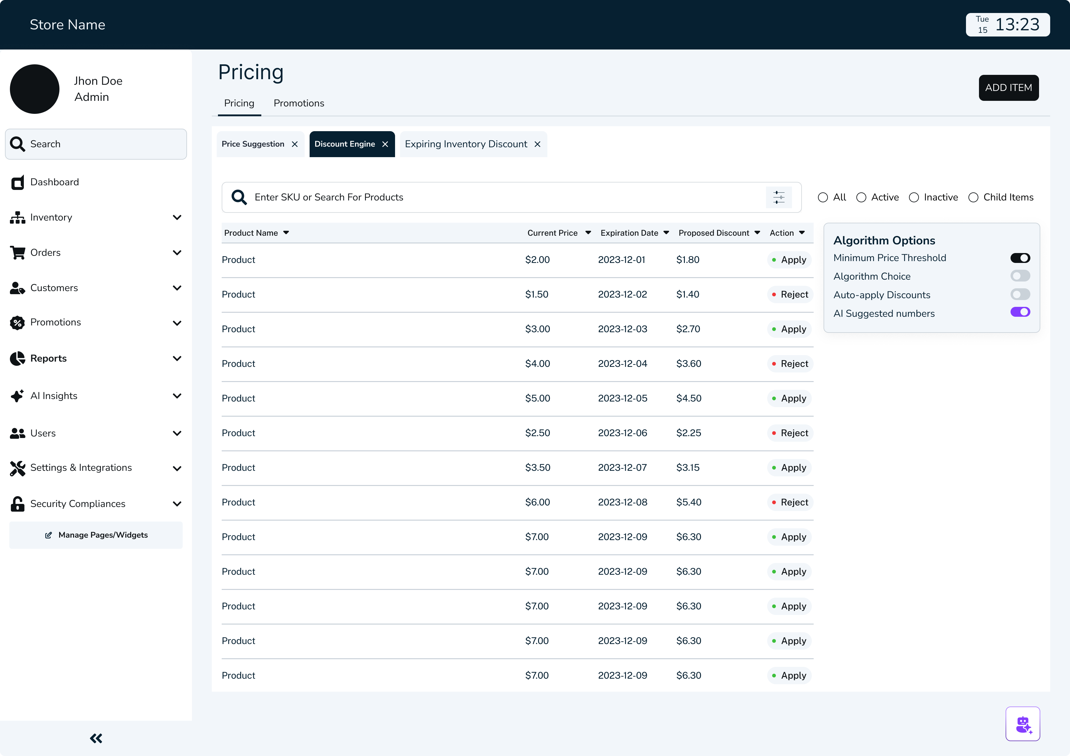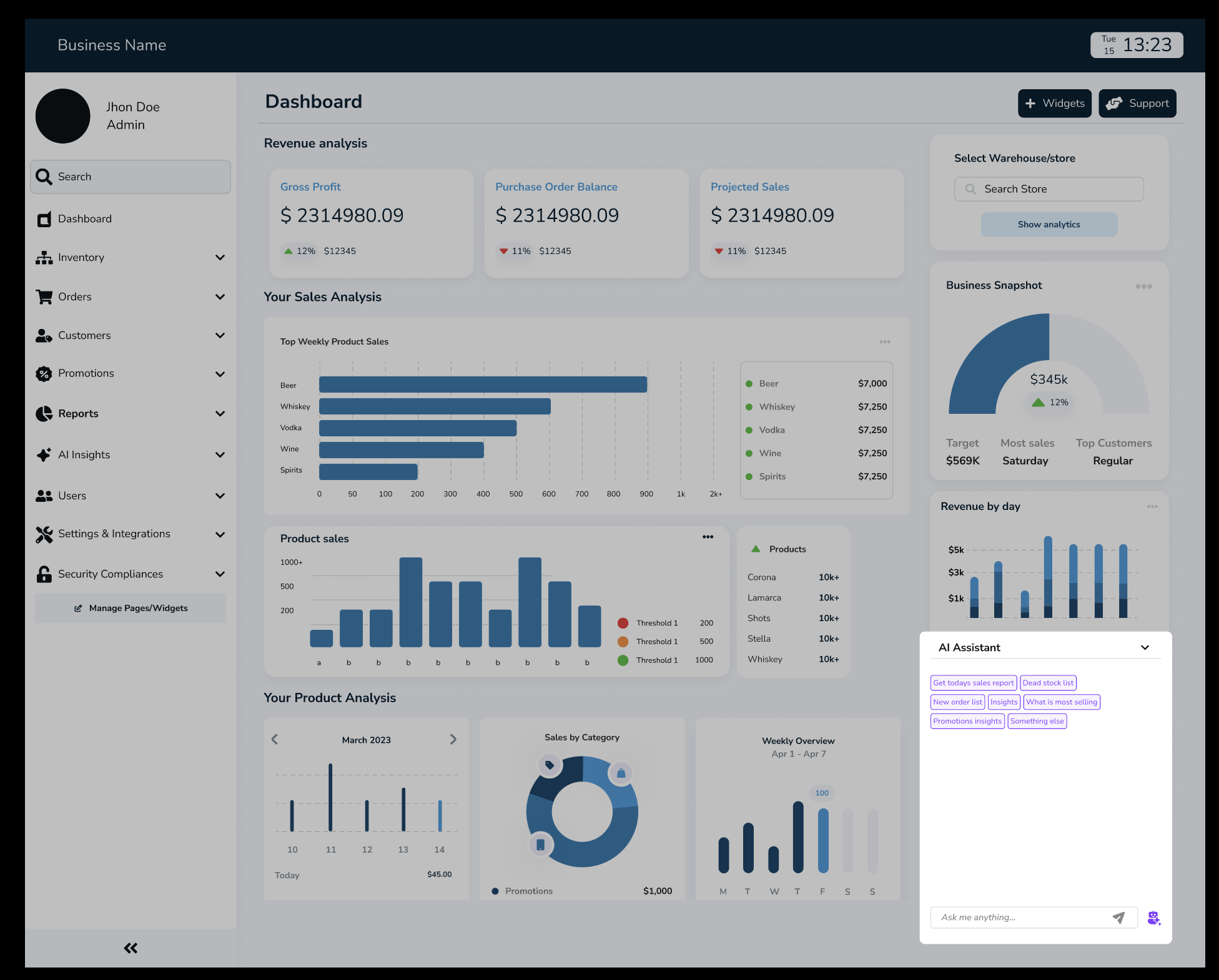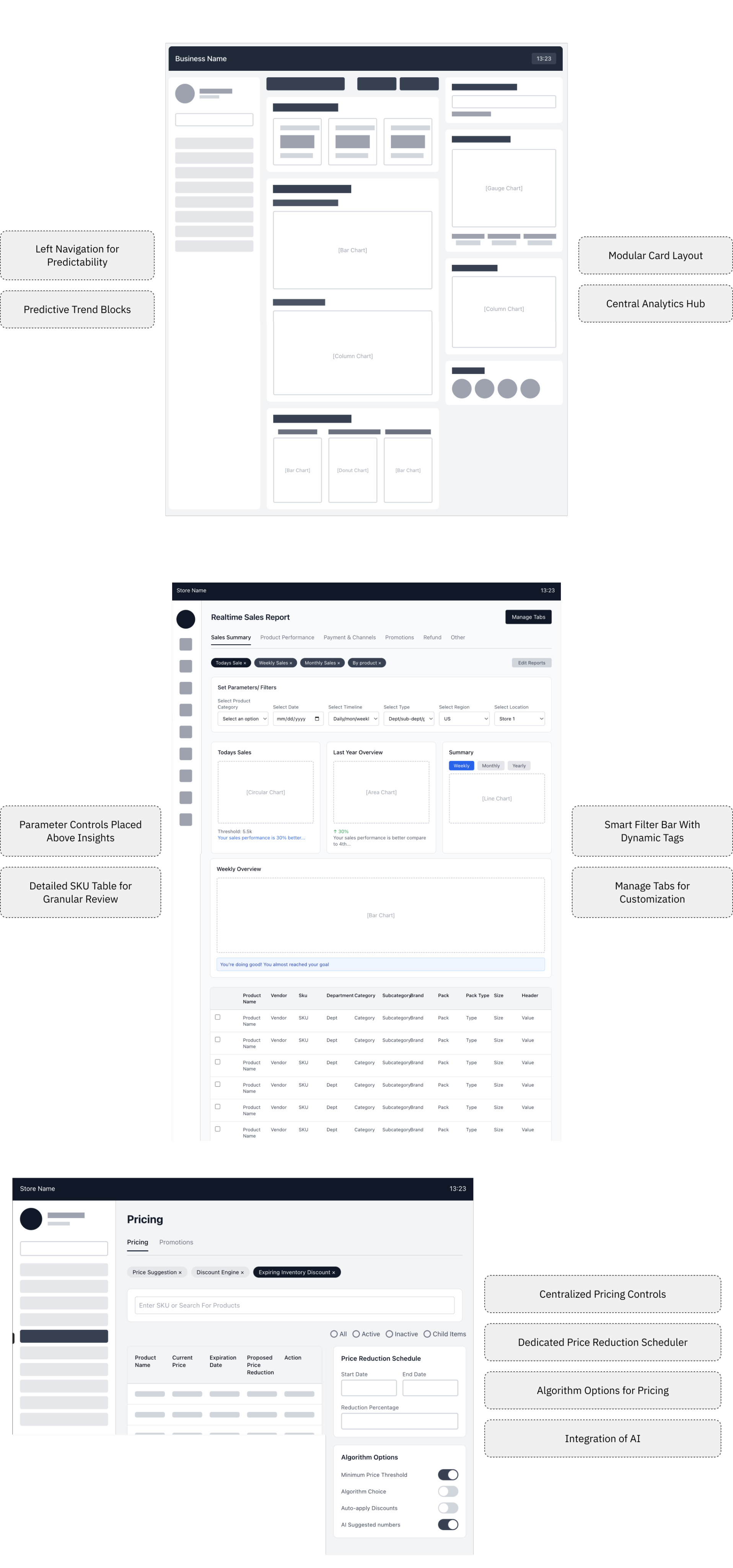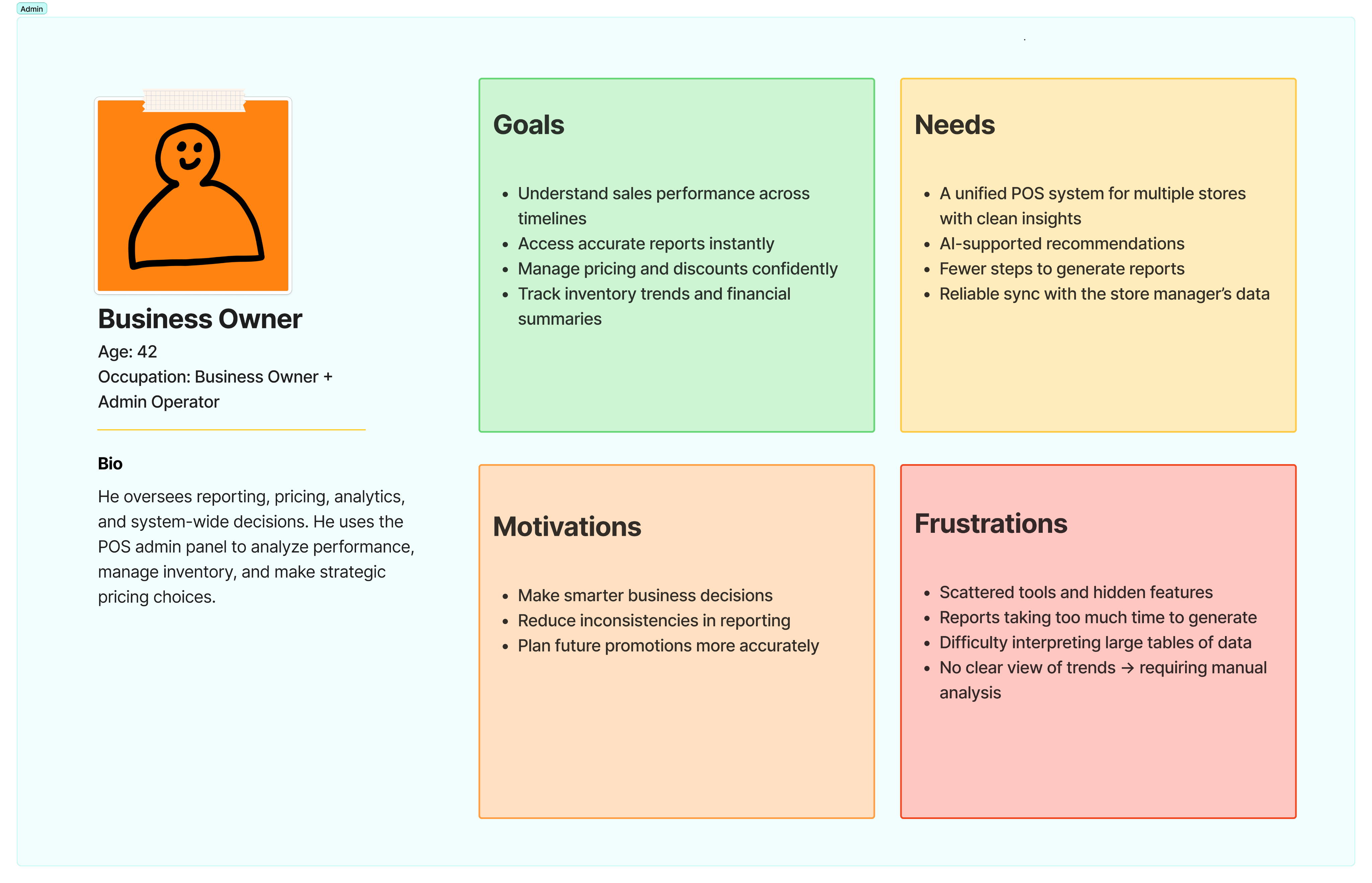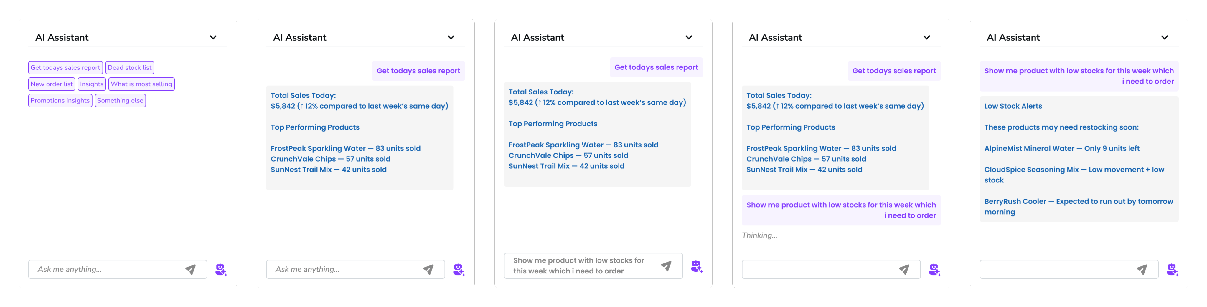 Designed a unified POS dashboard that simplified data visualization, introduced assistive AI for reporting, and improved information flow between admin and store manager sides.