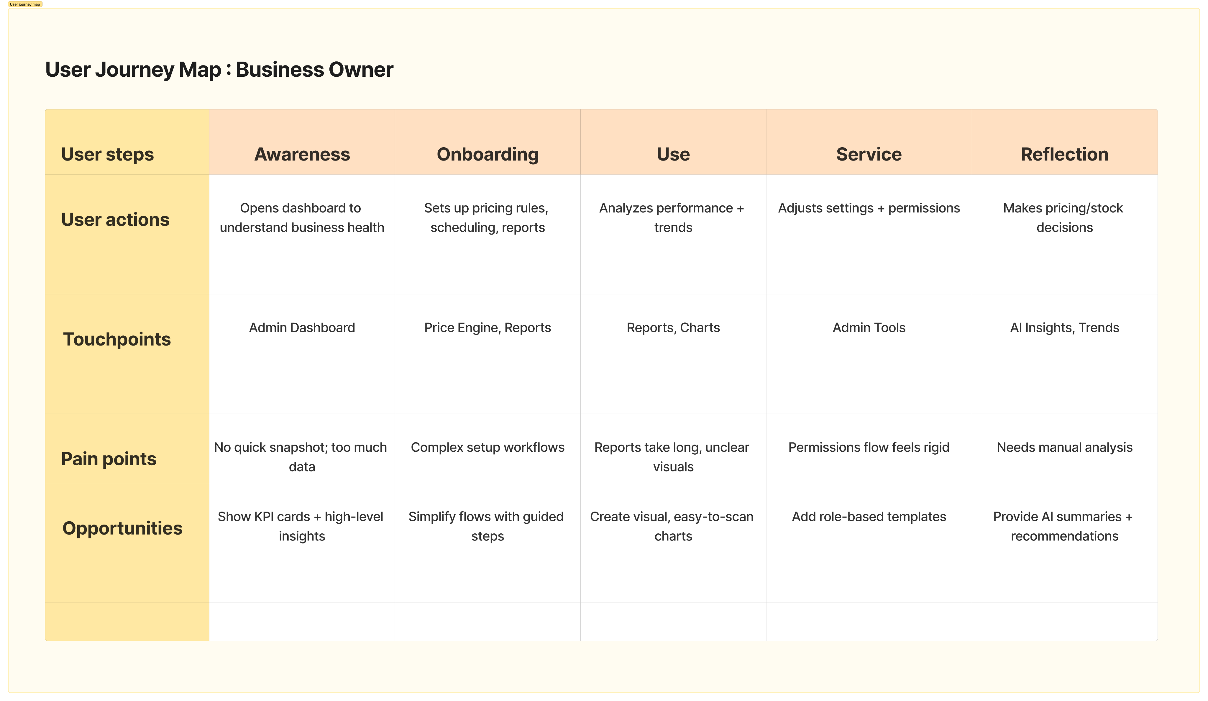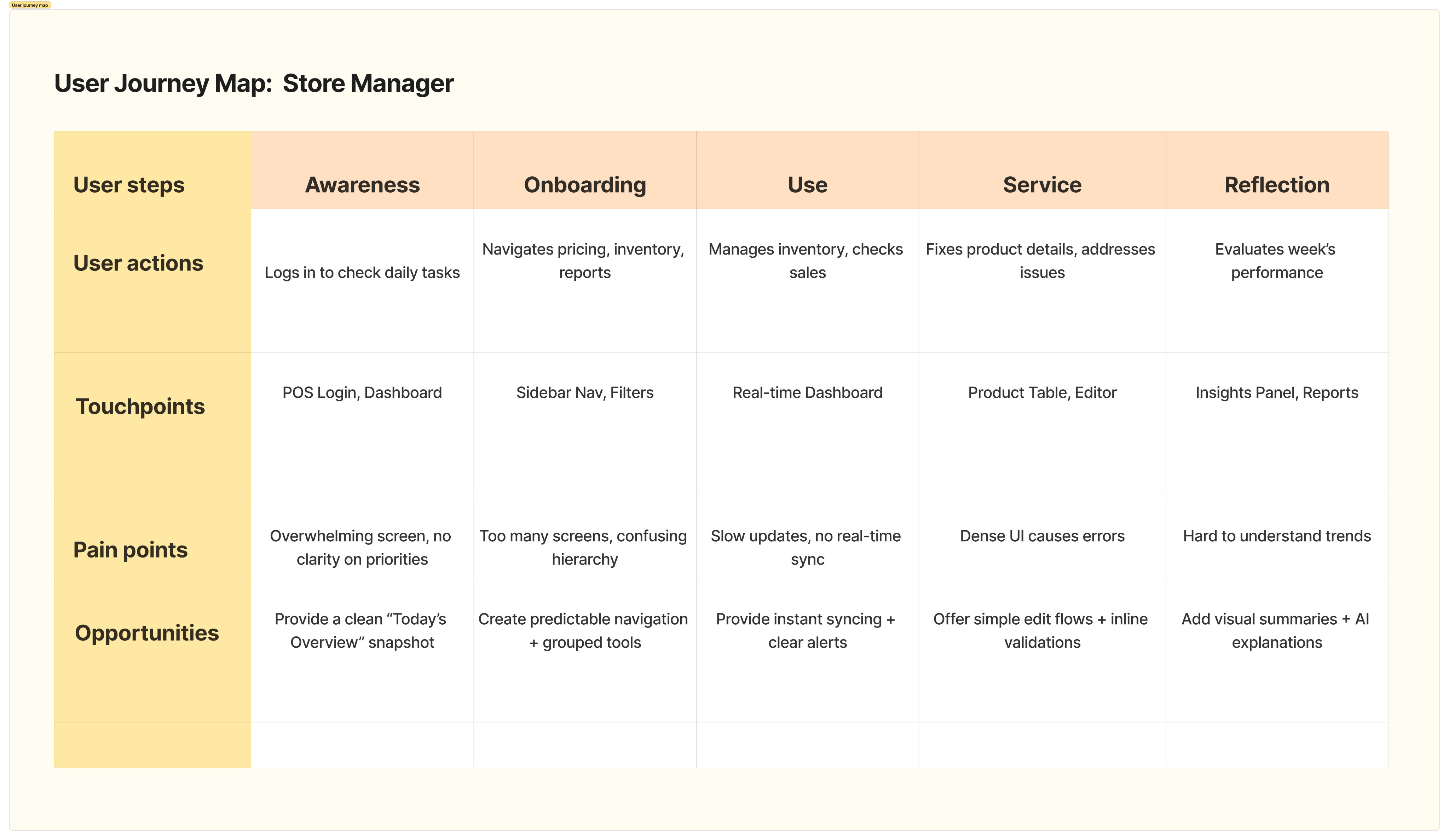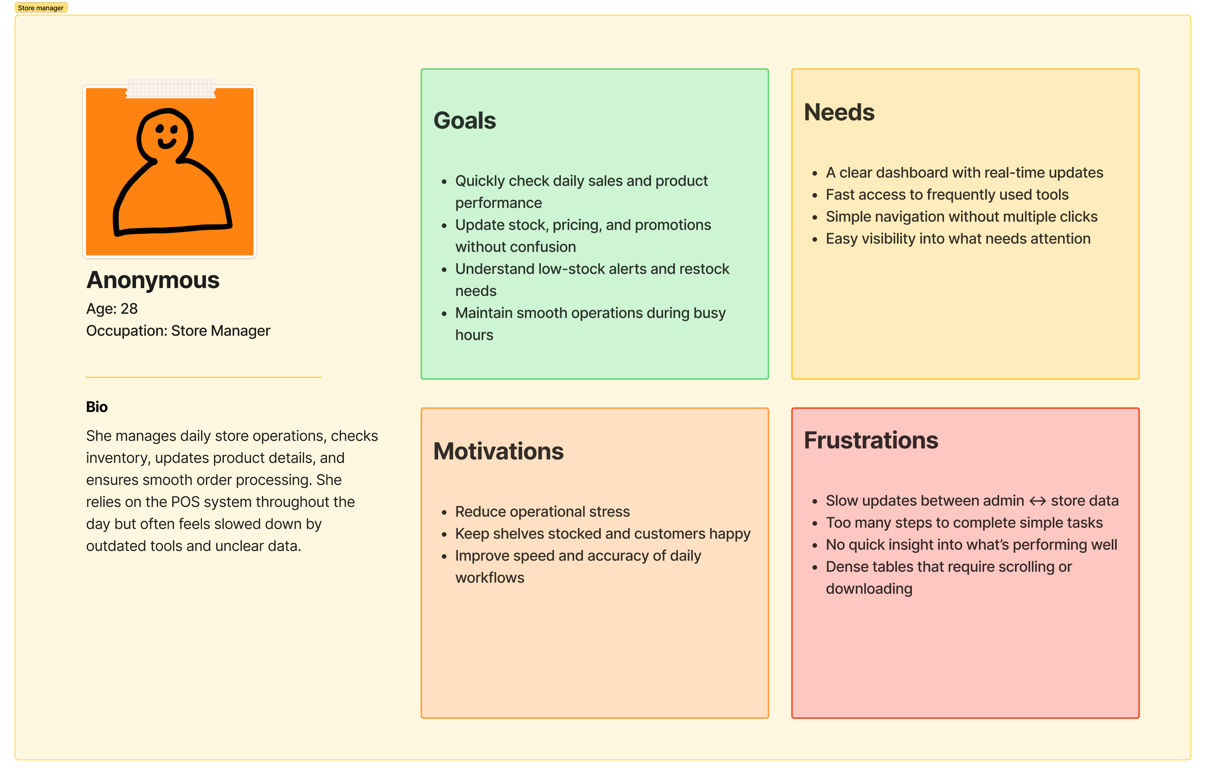To understand the full ecosystem, I analyzed how data moved from the store manager’s side to the admin database. There were delays, missing fields, and no real-time visibility which explained why users struggled with accuracy and decision-making.