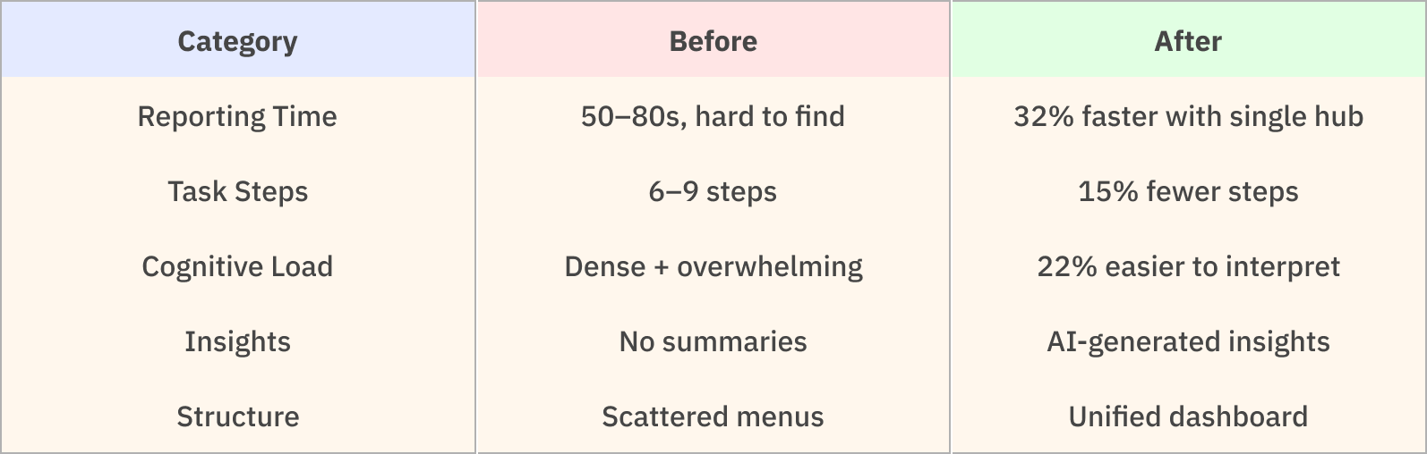 Reporting time was reduced allowing teams to access insights instantly instead of navigating multiple disconnected tools.